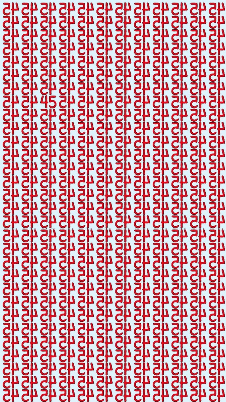 इस ऑप्टिकल इल्यूजन में एक जैसी आकृति बार-बार दिखाई गई है, लेकिन उनमें से एक नंबर 45 सीधा है, जबकि बाकी सभी उल्टे (inverted) हैं।