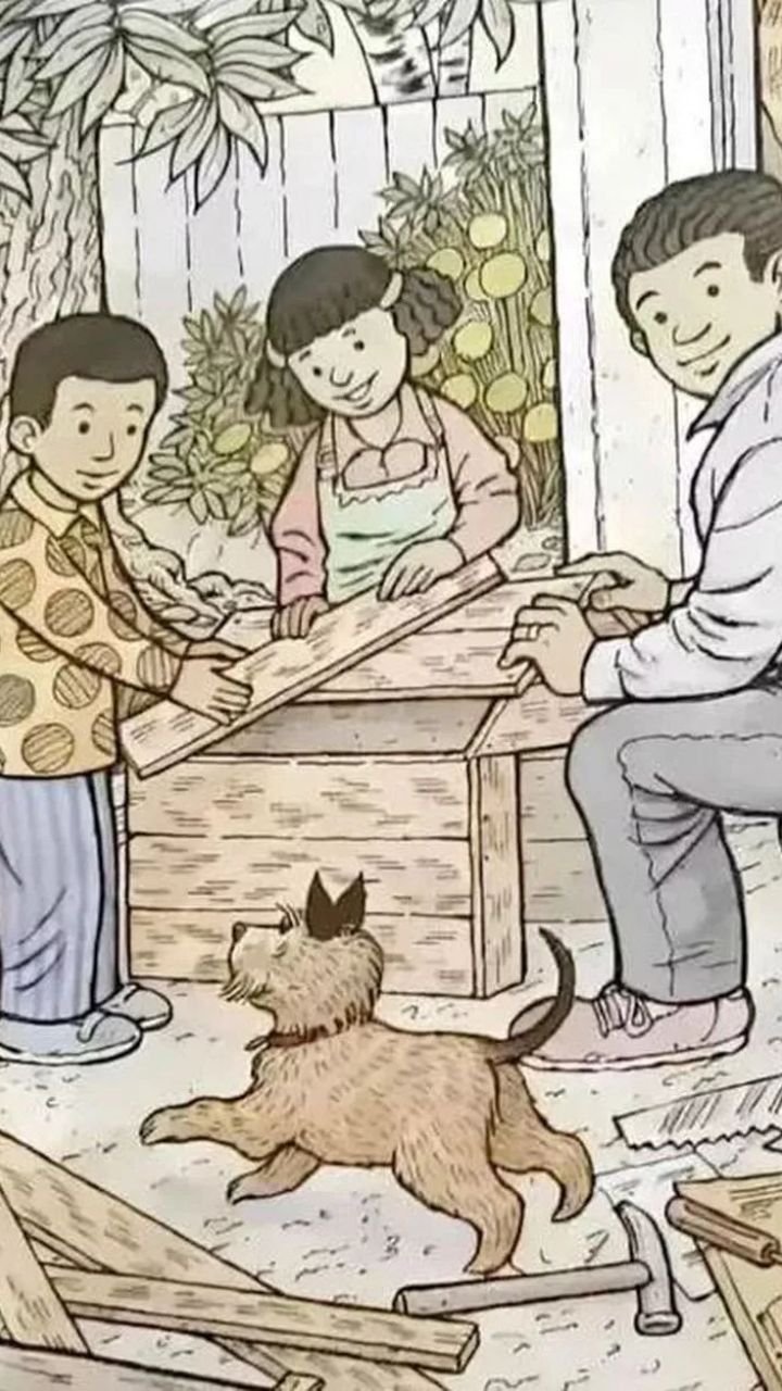 इस तस्वीर में एक परिवार लकड़ी के सामान को बनाते हुए दिख रहा है, और साथ में एक कुत्ता खेलता हुआ नजर आ रहा है।