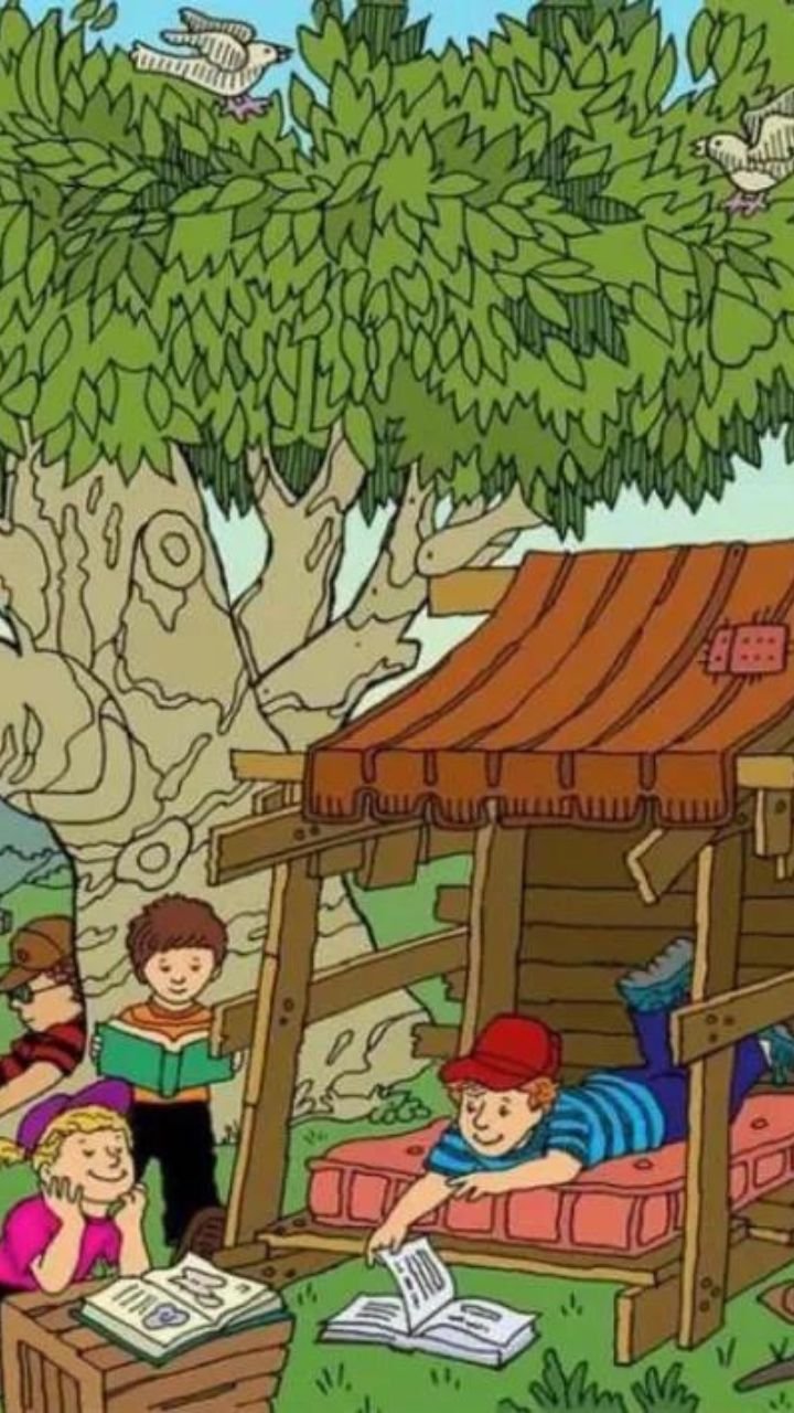 इस तस्वीर में पेड़, क्लब हाउस और बच्चों के अलावा घास, किताबें और पक्षी भी दिखाई दे रहे हैं।