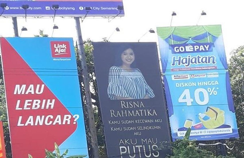 यदि आप सोचते हैं कि कहकर या लिखकर ही ब्रेकअप होते हैं तो आपको बता रहे हैं एक ऐसे बॉयफ्रेंड के बारे में बता रहे हैं जिसने सबसे अशिष्ट तरीके से खुद को धोखा देने वाली गर्लफ्रेंड से ब्रेकअप का ऐलान किया। इंडोनेशिया में एक व्यक्ति ने शहर की व्यस्त सड़क पर बिलबोर्ड किराये पर लेकर अपनी बेवफा गर्लफ्रेंड के साथ ब्रेकअप का ऐलान किया। लड़के ने बिलबोर्ड पर लिखा तुमने मेरा दिल तोड़ा है और मुझे धोखा दिया है। मैं तुमसे ब्रेकअप चाहता हूं। ये ब्रेकअप किसी एडवरटाइजमेंट से कम नहीं था।